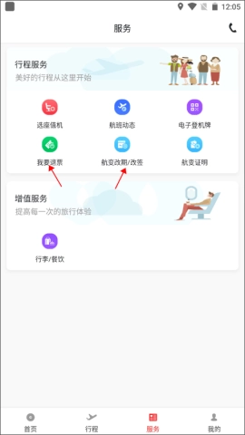 直接前往“服务”中选择“我要退票”或“航变改期/改签”功能,顺畅处理任何出行变化。