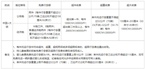公务舱两件行李,每件不超过32公斤;经济舱一律两件,最高23公斤。