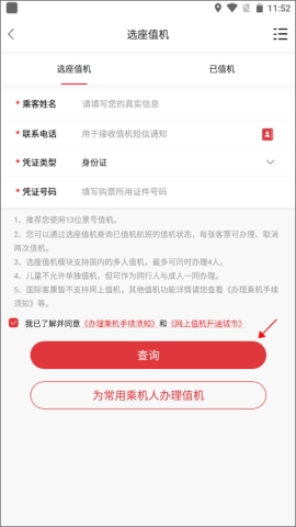 2、填写乘客信息,勾选相关条款后,点击查询,选择心仪座位,轻松搞定。