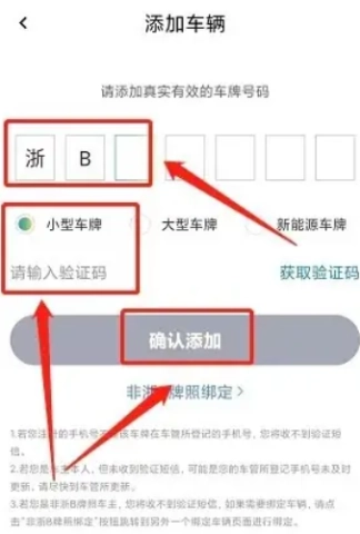 4、于添加车辆页面,按顺序输入车牌号码,挑选车辆类型,填写验证码,最终点击【确认添加】,便可完成登记。