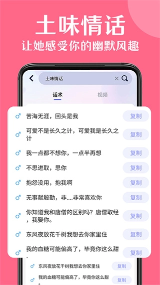 情话帮致力于教会用户高情商聊天,无论是幽默风趣、真诚坦率,还是直爽自然的风格,都能依据用户自身以及心仪对象的喜好,为用户定制个性化的情话聊天话术,助力用户成功追到心中的那个TA。