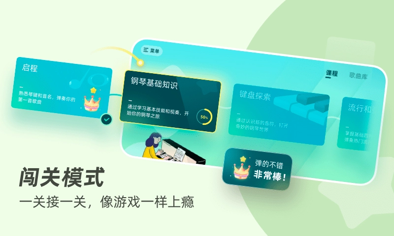 5、闯关模式:软件设有闯关模式,使钢琴学习如同游戏般令人着迷。用户能够借助完成任务,循序渐进地挑战难度更高的关卡,从而提升自身技能与知识。