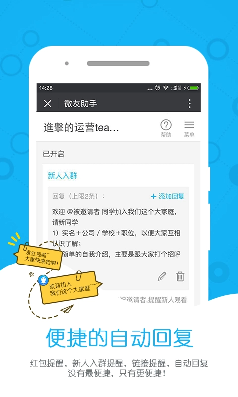 1. 设定好友自动加群方式。当开启此模式并设定起始关键词,就能自动邀请好友进群。