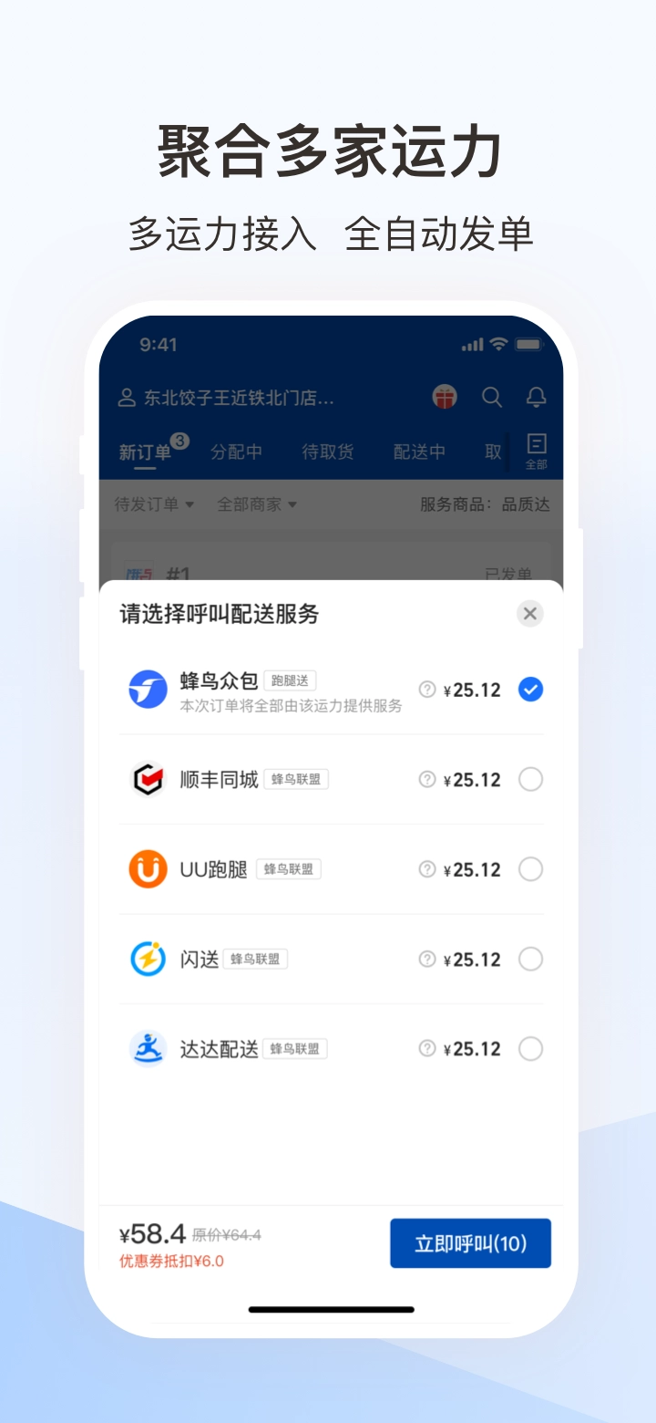 蜂鸟聚好送(原蜂鸟跑腿),这是一款专门为饿了么商户打造的配送工具。它聚合了多家配送服务,像蜂鸟众包、顺丰同城、UU跑腿、闪送以及达达配送都涵盖其中。通过它,各大平台的外卖订单能一键接单,并进行统一管理。同时,它还支持开具发票信息,无论是外卖配送还是超市配送都能胜任。要是有外卖订单相关事宜,还能一键电话呼叫,快速联系到客户。有需求的朋友可别错过啦。