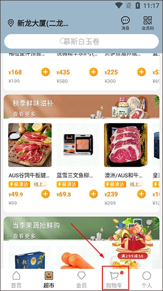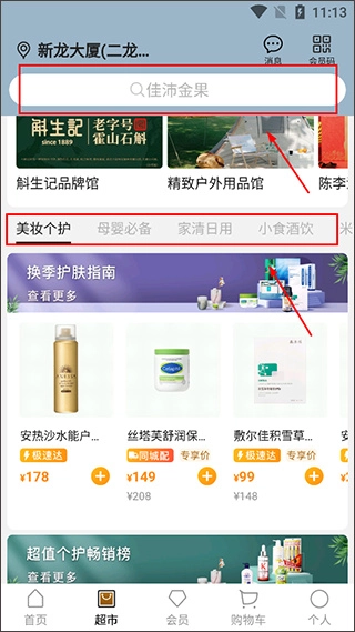 2、在超市页面,可点击上方搜索框,输入想要购买的商品进行搜索,也能点击下方的分类来查找商品。