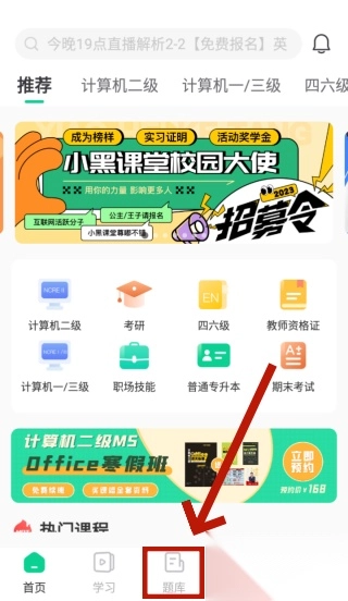 1、在本站安装好小黑课堂,打开软件来到首页,点击【题库】。