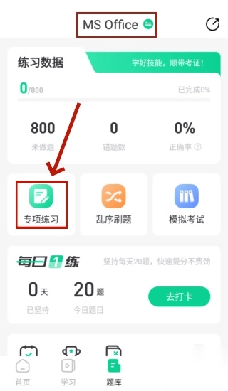 2、在界面上方切换您需要刷题的类型,这里以计算机二级MS Office为例,接着点击“专项练习”。