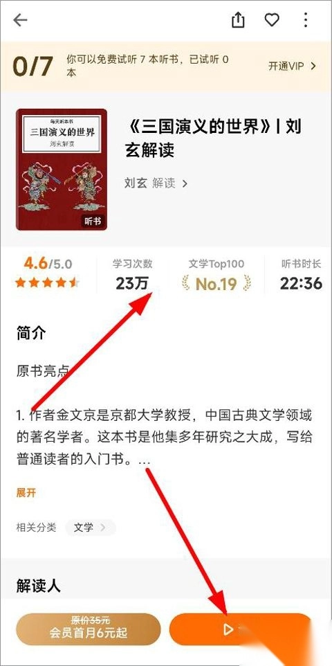 3、翻开书籍,就能看到诸如书籍的热门指数、学习次数、排名以及书籍简介等基本信息。用户既可以开通会员进行听书,也能够点击右下角享受免费试听。