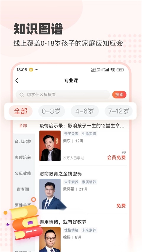 平台集结教育领域资深专家组成智库,搭建全周期心理发展培育课程体系。该体系覆盖新生儿潜能激发阶段(0 - 3 岁)、个性萌芽关键阶段(4 - 6 岁)、学习能力塑造阶段(7 - 12 岁)、人格定型黄金阶段(13 - 18 岁)以及职业素养锤炼阶段(18 +)这五大成长时期,为打造系统化家庭教育提升方案提供有力支持。