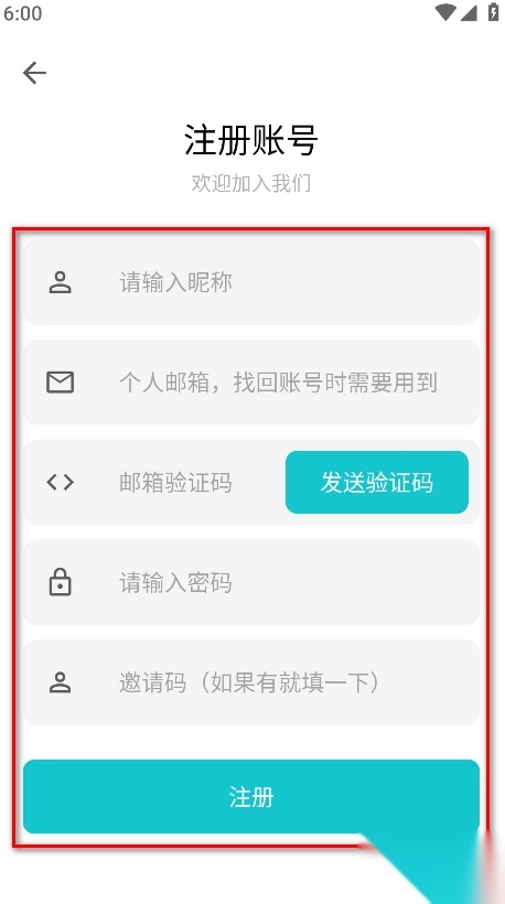 3.依次输入昵称、邮箱、验证码以及密码,随后点击“注册”按钮。