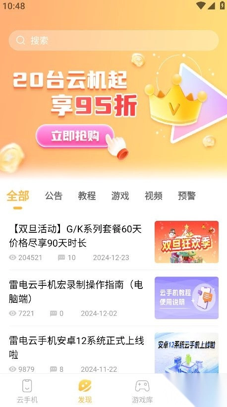 雷云手机最新版是一款云手机应用,依托云端一体化虚拟技术,借助网络把数据上传至云端服务器,随后云端将数据传输给用户,如此形成一个循环。只要用户终端有网络,就能随时随地操控多台手机。该软件具备云端托管、离线运行、离线自动游戏等诸多功能,能轻松解放双手,带你开启云端新生活。尤其当玩家有事时,软件还能自动辅助进行挂机操作,避免出现举报和挂机违规等情况,真的超级好用。