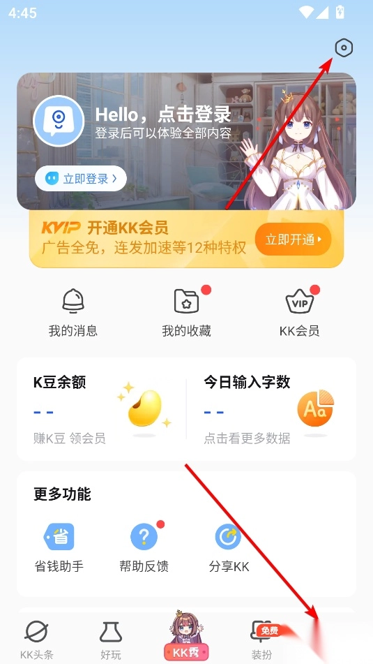 在个性化定制方面,KK键盘允许用户自由自定义皮肤、字体以及音效,从而打造出独一无二的个性化输入界面。无论是日常聊天,还是充满激情的游戏互动等各类场景,KK键盘都能完美适配,为用户带来出色的使用体验。1、点击桌面上的KK键盘图标,之后进入“我的”界面,点击右上角的按钮
