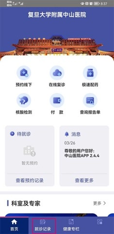1. 进入上海中山医院相关界面,点击【预约就诊】选项。