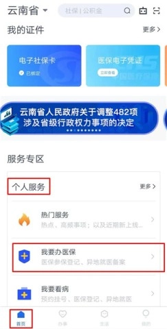 1. 首先在首页找到并点击“个人服务”,接着在弹出的选项中选择“我要办医保”,以此开启相关操作。