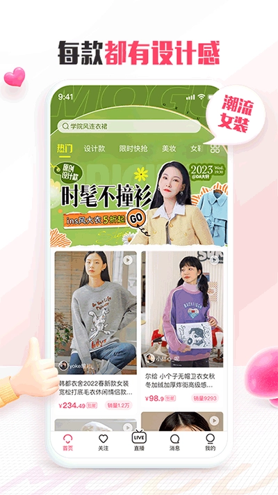 2、蘑菇街拥有数以万计身材与风格各不相同的主播,通过直播,你能直观看到上身搭配的效果,选择整套购买会更加省心。