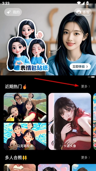 1、打开漫画相机,点击近期热门右侧的更多按钮;
