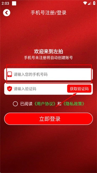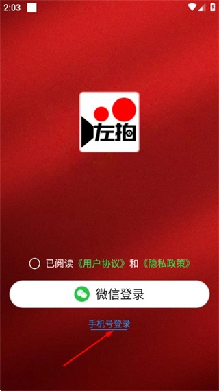 1、在左拍的登录页面,点击手机号登录选项,进入手机号登录页面。