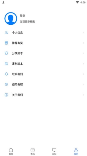 5、点击我的,可以登录,分享,定制脚本