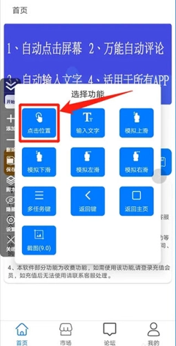 2、点击功能框添加位置,在你指定的位置添加一个点击功能