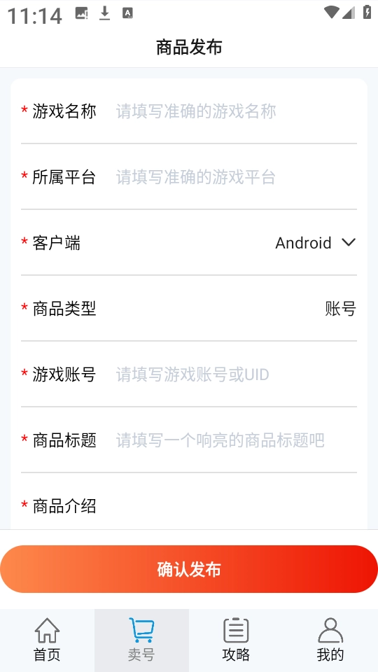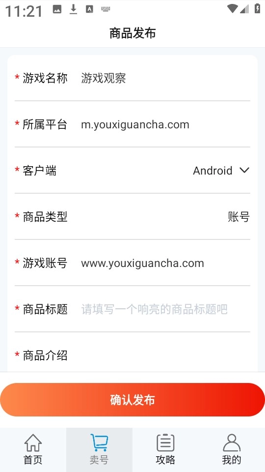 2、然后按照自定义的步骤,依次填写游戏名称、所属平台、商品类型、商品标题、商品介绍等信息。